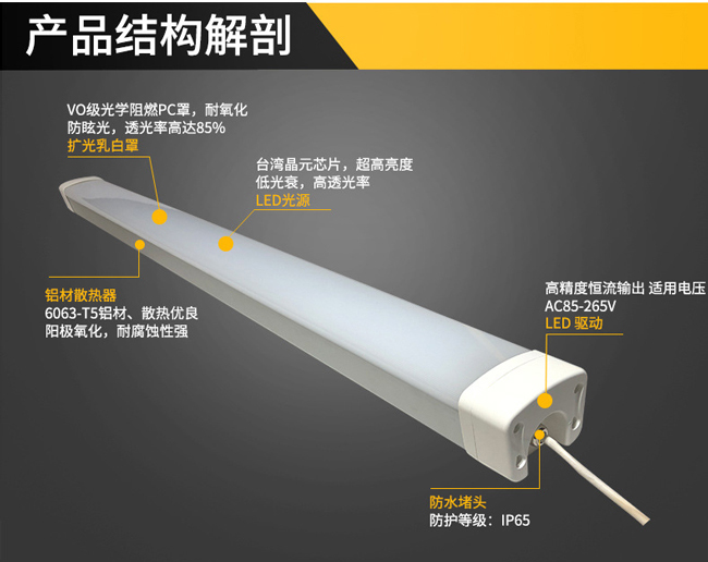 - 產(chǎn)品簡介: 產(chǎn)品特點: ?寬輸入電壓范圍,適用于任何國家、地域 ?LED光效高達100流明以上 ?高效的散熱處理,光通維持率近94% ?內(nèi)置隔離低壓恒流驅(qū)動,安全、穩(wěn)定、可靠 ?燈殼通過2500V耐壓測試; ?燈殼由阻燃硬質(zhì)PVC擠出成型,強度高、耐腐蝕、重量輕 ?安裝方便,壽命長,免維護 三防:防水、防塵、防腐,防護等級IP65 適用場所: 工廠車間、辦公室、食品廠、冷庫、商場、超市、紡織廠、防腐等場所的照明, 可完全替代傳統(tǒng)三防燈具