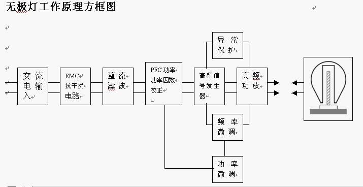 無極燈在結(jié)構(gòu)上大致由三部分組成,高頻電子鎮(zhèn)流器,功率耦合器(內(nèi)耦合,2.65MHZ)和涂有稀土熒光粉的玻璃泡殼(可以是多種形狀,大家見過圓球型的,方形的,等等)。無極燈鎮(zhèn)流器在市電(50HZ)的作用下,產(chǎn)生一個2.65MHz高頻正弦電壓,并同時產(chǎn)生一個3000V左右的點(diǎn)火電壓,通過功率耦合器在涂有稀土熒光粉的玻璃泡殼內(nèi)瞬間建立一個高頻磁場,高頻磁場又同時產(chǎn)生高頻交變電場,導(dǎo)致泡殼內(nèi)部的惰性氣體(氪氣和氬氣的混合氣體)發(fā)生電離并進(jìn)而產(chǎn)生雪崩效應(yīng)(應(yīng)該是大學(xué)物理有講,半導(dǎo)體那一章,齊那擊穿和雪崩擊穿), 產(chǎn)生大量的紫外線輻射.熒光粉在紫外線作用下產(chǎn)生可見光.